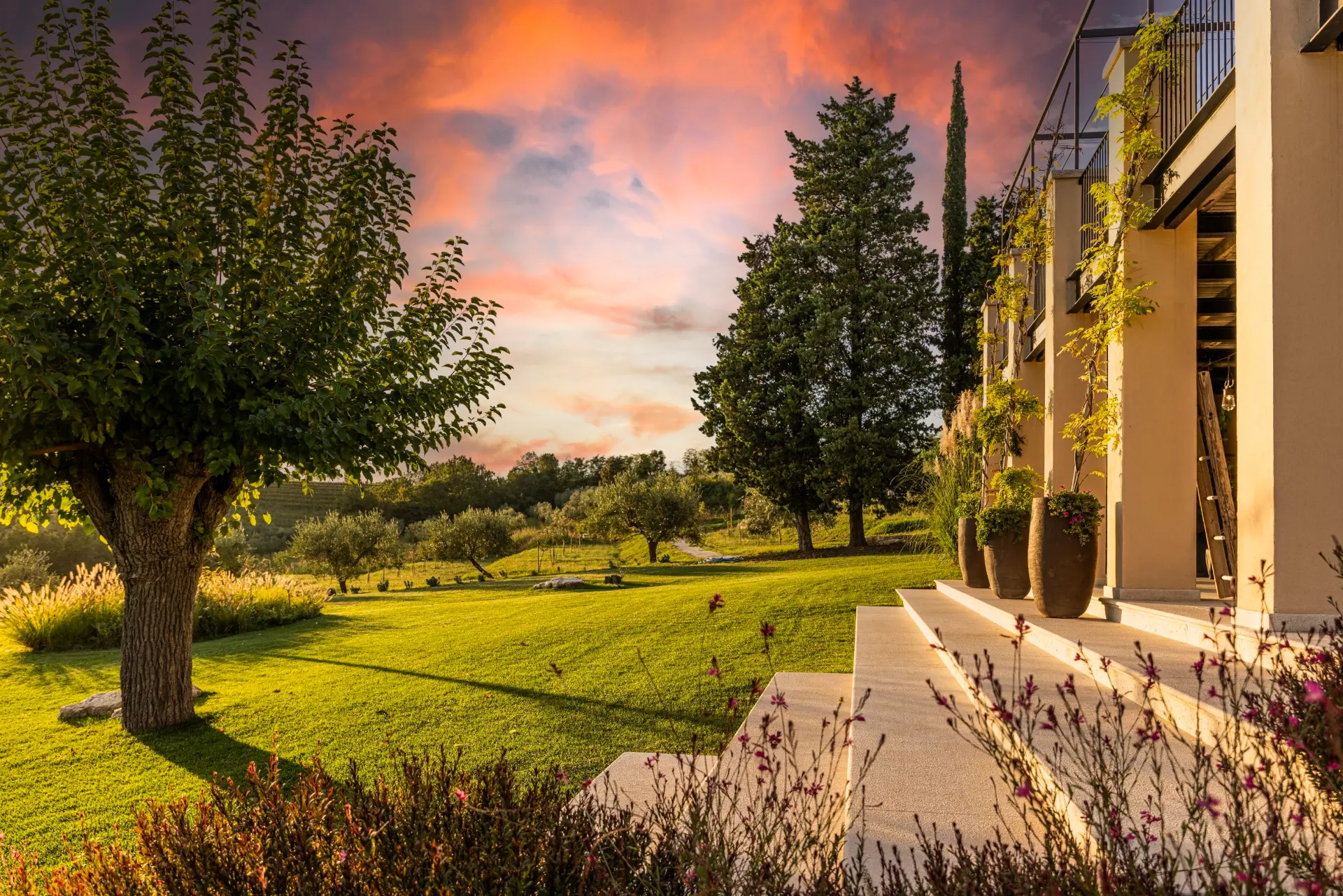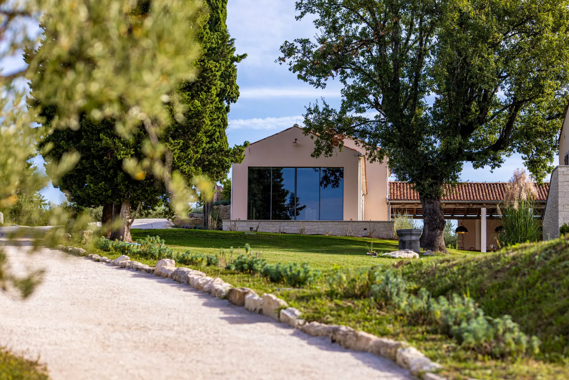 Set within over 2 hectares of private land, the estate is surrounded by organic vineyards and olive groves, ensuring complete privacy and a natural Mediterranean setting.