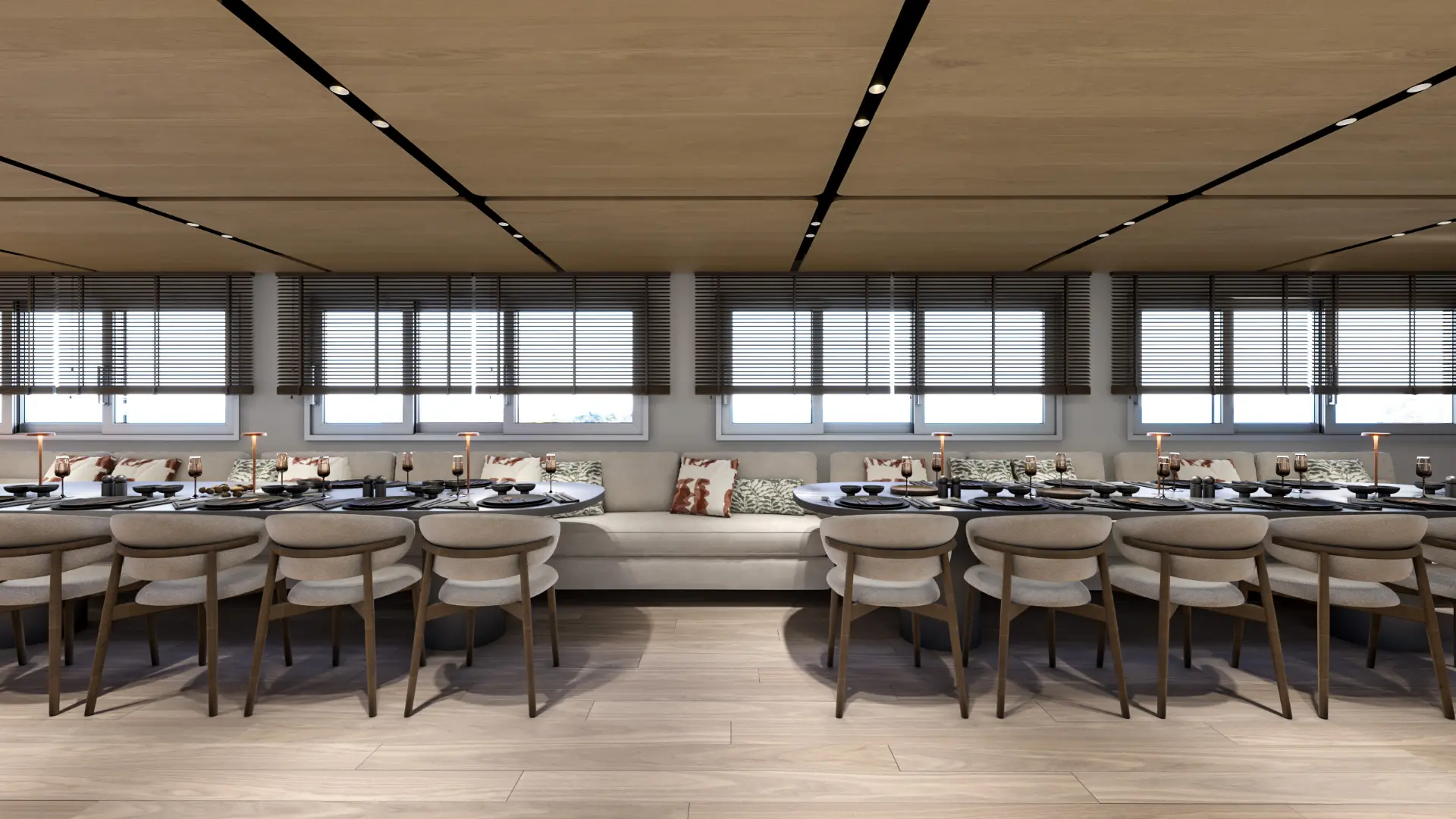 The interior of this luxury mini cruiser Premier reflects a philosophy of elegant minimalism. Large panoramic windows illuminate the spacious salon with abundant natural light. In addition, the airy feel creates a perfect environment for gourmet dining and socializing. Transitioning from the salon to the aft deck is incredibly easy. Moreover, the lounge area connects you directly to the surrounding sea. You will find that the neutral tones and high-end finishes enhance the calm ambiance. Indeed, the indoor spaces feel both grand and intimately cozy.